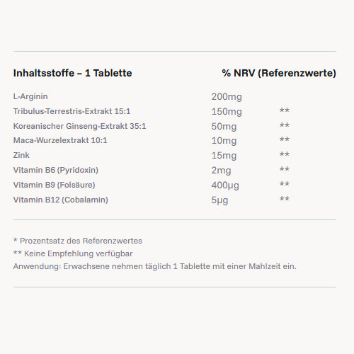 La fórmula combina L-arginina (200 mg), extracto de Tribulus terrestris 15:1 (150 mg), extracto de ginseng coreano 35:1 (50 mg) y extracto de maca 10:1 (50 mg) con zinc (15 mg), vitamina B6 (2 mg), ácido fólico/vitamina B9 (400 µg) y vitamina B12 (5 µg) por comprimido. El zinc contribuye al mantenimiento de los niveles normales de testosterona en sangre y favorece el metabolismo normal de los ácidos grasos. Las vitaminas B contribuyen al metabolismo energético normal; las vitaminas B6 y B12 contribuyen a reducir el cansancio y la fatiga, mientras que el ácido fólico favorece la formación normal de la sangre. Plantas clásicas como el ginseng, la maca y el tribulus completan la mezcla y son adecuadas para momentos de gran estrés diario. En conjunto, se obtiene una combinación de micronutrientes y extractos de plantas probados, adecuada para el uso diario.
